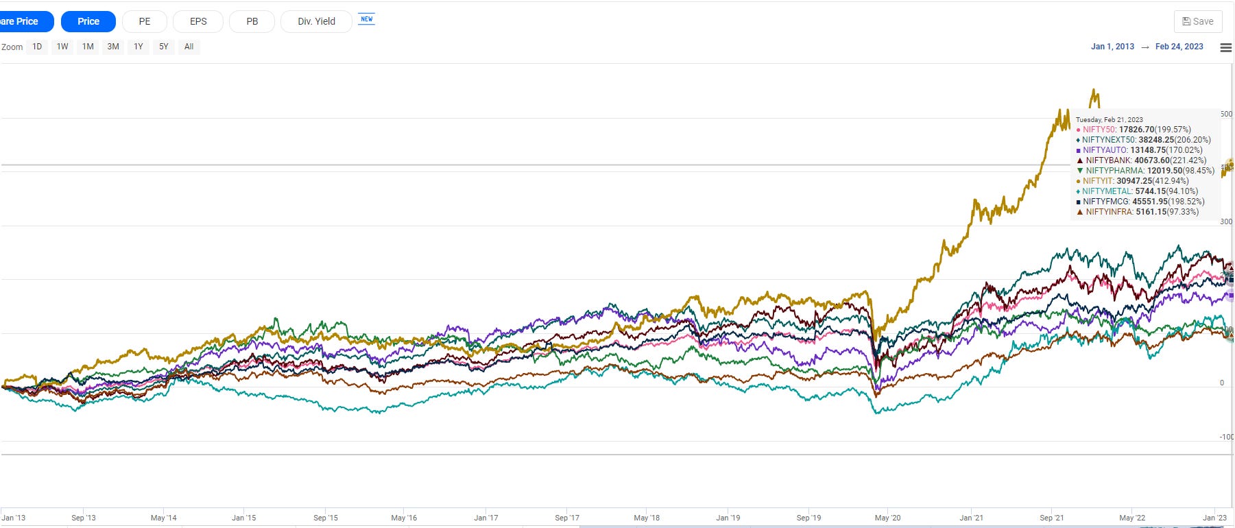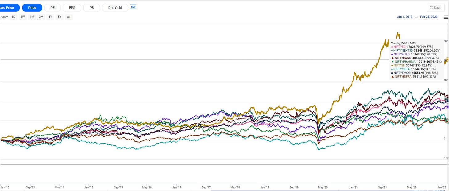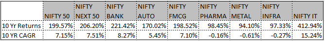 The above graph represents the return by the various sectoral indices over the last 10 years. If you think that reading the above graph is difficult, I agree, and therefore have captured the 10 Year point to point returns as 10-Year CAGR return of the NIFTY and other indices below: