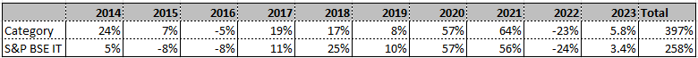 Well unlike the performance of the large-cap active funds (refer table at the start) which were not able to beat their NIFTY 50 benchmark, the story in the NIFTY IT sectoral mutual funds is a bit different, with the NIFTY IT focused mutual funds category being able to out-perform the index in 9 out of 10 years (may be coz these funds have been able to invest across market-caps).