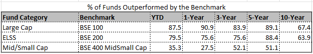 For this analysis, the SPIVA India Scorecard was used. For those who don’t know SPIVA India Scorecard compares the performance of actively managed funds against the performance of the non-sector specific indexes (namely, Large Cap, Mid/Small Cap, and ELSS’s performance) and measures how many such active funds were outperformed by the index.